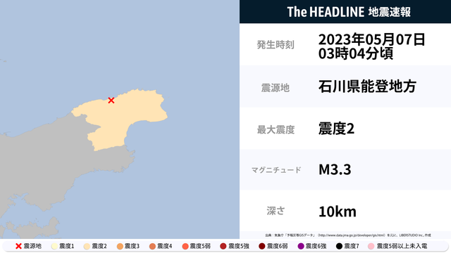 05月07日03時04分頃、石川県能登地方を震源とするマグニチュード3.3の地震が観測された。最大震度2を観測したのは、石川県。
