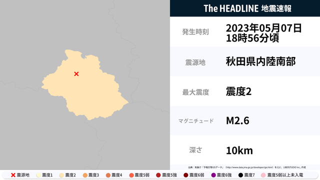 5月7日18時56分頃、秋田県で最大震度2の地震を観測