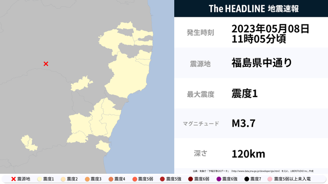 05月08日11時05分頃、福島県中通りを震源とするマグニチュード3.7の地震が観測された。最大震度1を観測したのは、福島県・茨城県など。