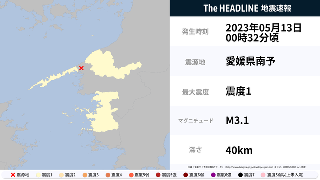 5月13日0時32分頃、愛媛県で最大震度1の地震を観測