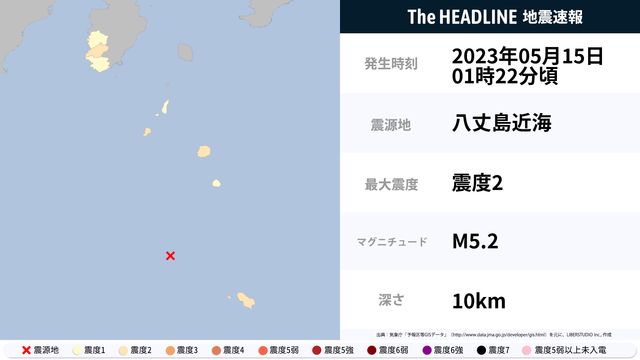 05月15日01時22分頃、八丈島近海を震源とするマグニチュード5.2の地震が観測された。最大震度2を観測したのは、東京都・静岡県。