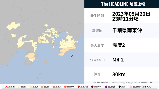 5月20日23時11分頃、千葉県・神奈川県などで最大震度2の地震を観測