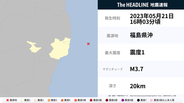 05月21日16時03分頃、福島県沖を震源とするマグニチュード3.7の地震が観測された。最大震度1を観測したのは、福島県。