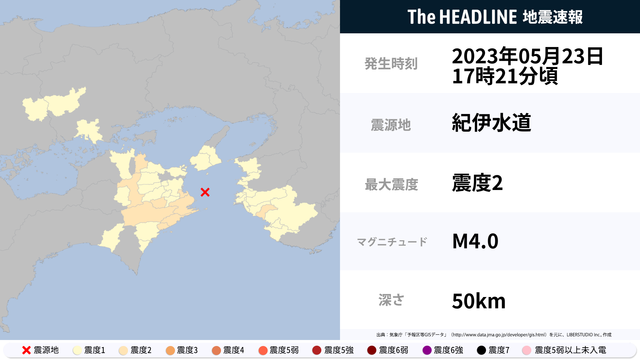 5月23日17時21分頃、和歌山県・徳島県などで最大震度2の地震を観測