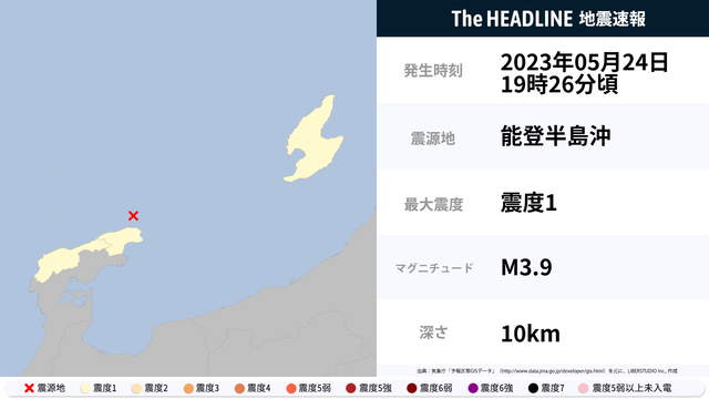 05月24日19時26分頃、能登半島沖を震源とするマグニチュード3.9の地震が観測された。最大震度1を観測したのは、新潟県・石川県。
