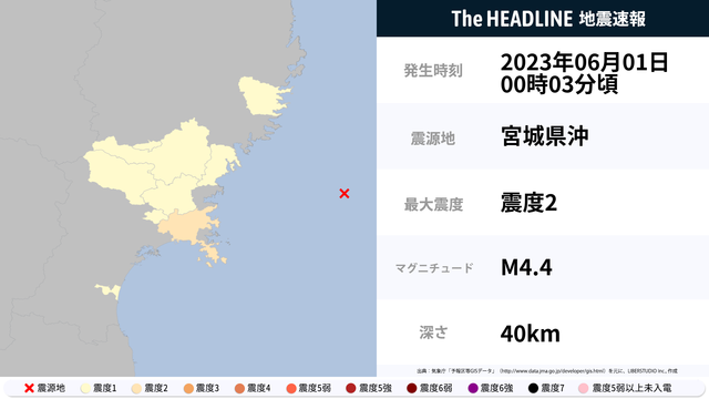 06月01日00時03分頃、宮城県沖を震源とするマグニチュード4.4の地震が観測された。最大震度2を観測したのは、宮城県。