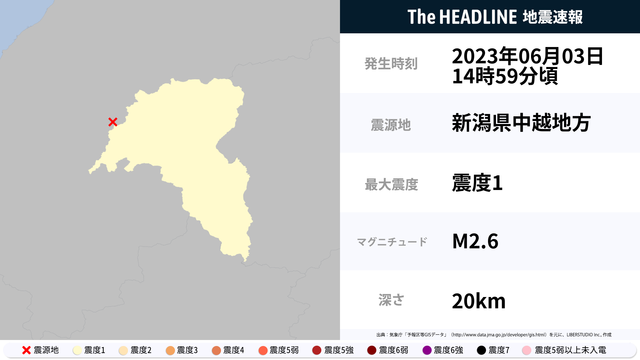 06月03日14時59分頃、新潟県中越地方を震源とするマグニチュード2.6の地震が観測された。最大震度1を観測したのは、新潟県。