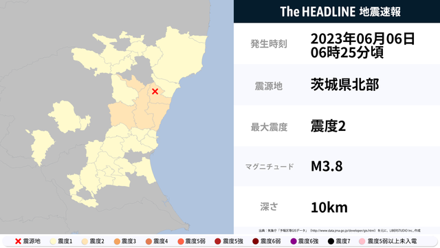 6月6日6時25分頃、福島県・茨城県で最大震度2の地震を観測