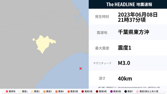 06月08日21時37分頃、千葉県東方沖を震源とするマグニチュード3.0の地震が観測された。最大震度1を観測したのは、千葉県。