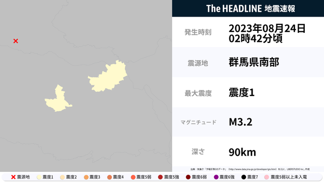 08月24日02時42分頃、群馬県南部を震源とするマグニチュード3.2の地震が観測された。最大震度1を観測したのは、埼玉県。