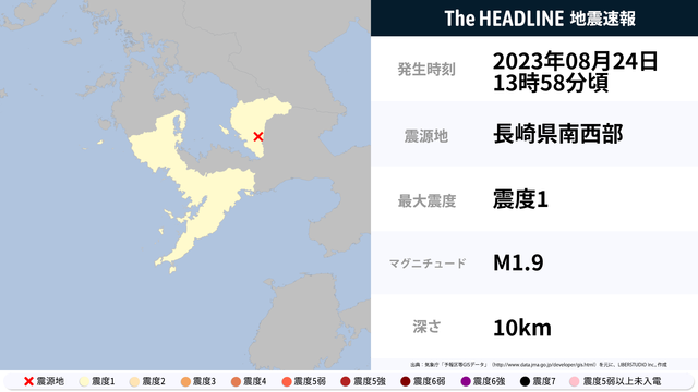 08月24日13時58分頃、長崎県南西部を震源とするマグニチュード1.9の地震が観測された。最大震度1を観測したのは、長崎県。