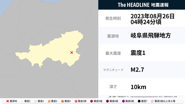 08月26日04時24分頃、岐阜県飛騨地方を震源とするマグニチュード2.7の地震が観測された。最大震度1を観測したのは、岐阜県。
