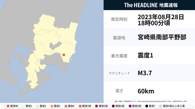08月28日18時00分頃、宮崎県南部平野部を震源とするマグニチュード3.7の地震が観測された。最大震度1を観測したのは、宮崎県・鹿児島県。