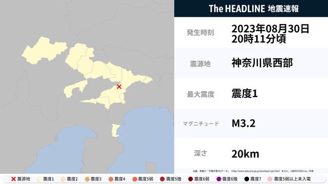 08月30日20時11分頃、神奈川県西部を震源とするマグニチュード3.2の地震が観測された。最大震度1を観測したのは、神奈川県・山梨県など。