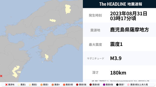 08月31日03時17分頃、鹿児島県薩摩地方を震源とするマグニチュード3.9の地震が観測された。最大震度1を観測したのは、岡山県・広島県など。