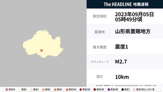 9月5日5時49分頃、山形県で最大震度1の地震を観測