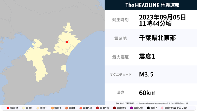 9月5日11時44分頃、千葉県で最大震度1の地震を観測