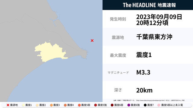 09月09日20時12分頃、千葉県東方沖を震源とするマグニチュード3.3の地震が観測された。最大震度1を観測したのは、千葉県。