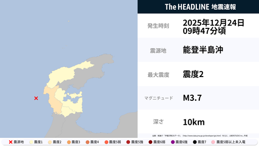 9月10日9時25分頃、石川県で最大震度1の地震を観測
