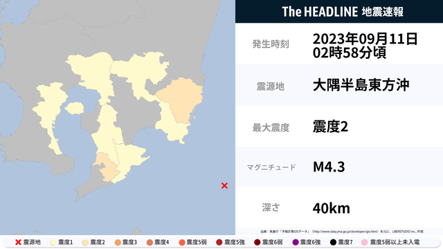09月11日02時58分頃、大隅半島東方沖を震源とするマグニチュード4.3の地震が観測された。最大震度2を観測したのは、宮崎県・鹿児島県。