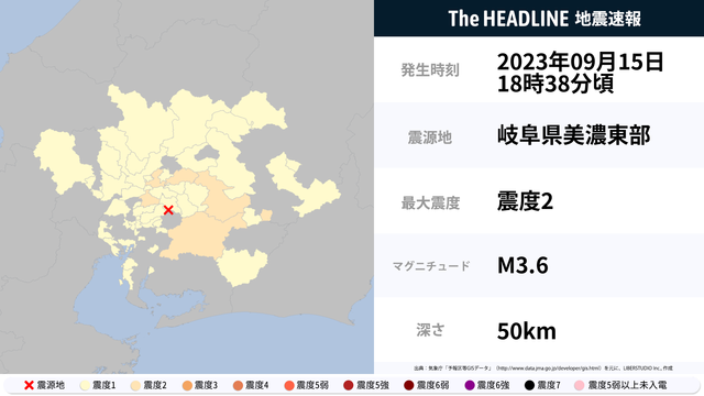 09月15日18時38分頃、岐阜県美濃東部を震源とするマグニチュード3.6の地震が観測された。最大震度2を観測したのは、長野県・岐阜県など。