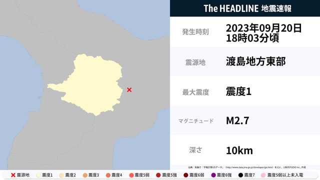 9月20日18時3分頃、北海道で最大震度1の地震を観測
