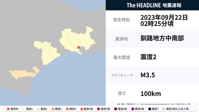 09月22日02時25分頃、釧路地方中南部を震源とするマグニチュード3.5の地震が観測された。最大震度2を観測したのは、北海道。