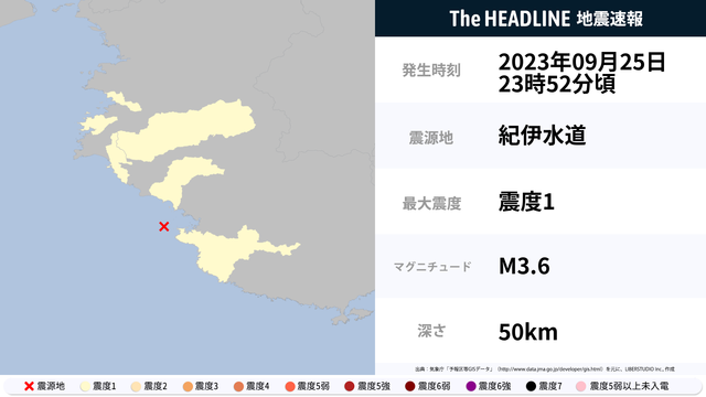 09月25日23時52分頃、紀伊水道を震源とするマグニチュード3.6の地震が観測された。最大震度1を観測したのは、和歌山県。