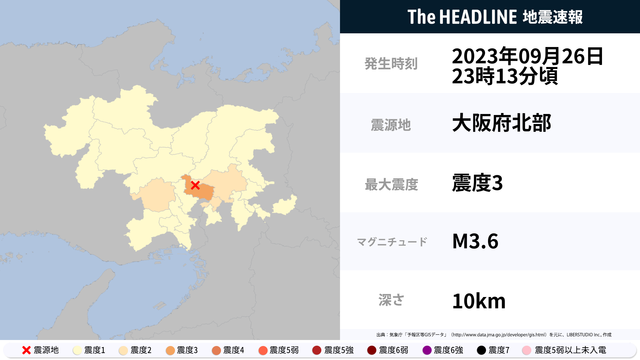 9月26日23時13分頃、大阪府で最大震度3の地震を観測