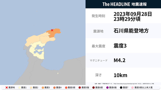 09月28日23時29分頃、石川県能登地方を震源とするマグニチュード4.2の地震が観測された。最大震度3を観測したのは、石川県。