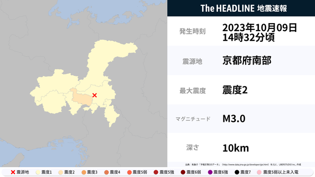 10月09日14時32分頃、京都府南部を震源とするマグニチュード3.0の地震が観測された。最大震度2を観測したのは、大阪府。