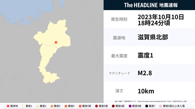 10月10日18時24分頃、滋賀県北部を震源とするマグニチュード2.8の地震が観測された。最大震度1を観測したのは、滋賀県。