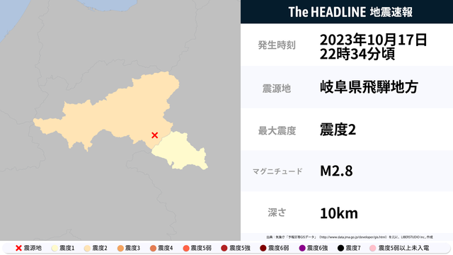 10月17日22時34分頃、岐阜県で最大震度2の地震を観測
