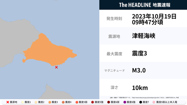 10月19日09時47分頃、津軽海峡を震源とするマグニチュード3.0の地震が観測された。最大震度3を観測したのは、北海道。