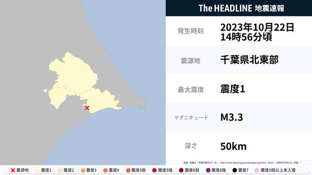 10月22日14時56分頃、千葉県で最大震度1の地震を観測