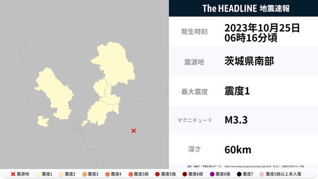10月25日6時16分頃、茨城県南部を震源とするマグニチュード3.3の地震が観測された。最大震度1を観測したのは、栃木県・群馬県。