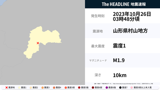 10月26日3時48分頃、山形県で最大震度1の地震を観測
