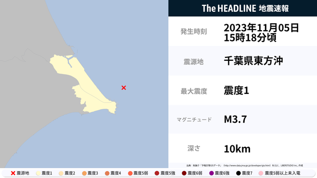 11月5日15時18分頃、千葉県東方沖を震源とするマグニチュード3.7の地震が観測された。最大震度1を観測したのは、茨城県・千葉県。