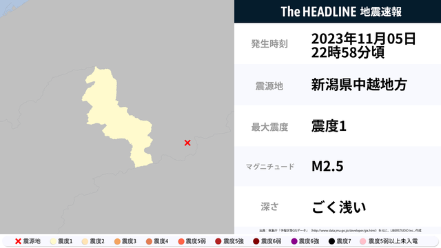 11月5日22時58分頃、新潟県中越地方を震源とするマグニチュード2.5の地震が観測された。最大震度1を観測したのは、長野県。