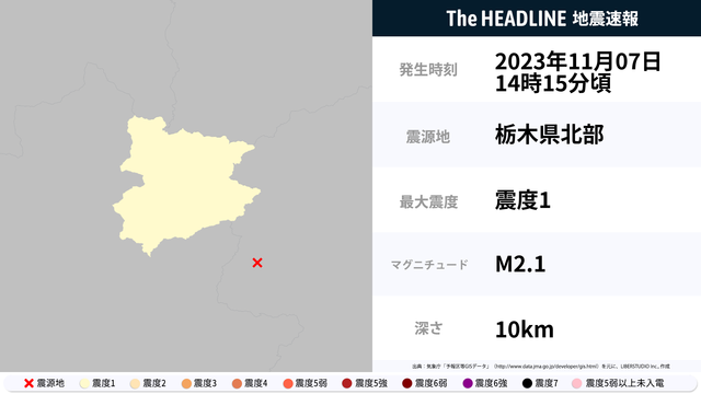 11月7日14時15分頃、栃木県北部を震源とするマグニチュード2.1の地震が観測された。最大震度1を観測したのは、群馬県。