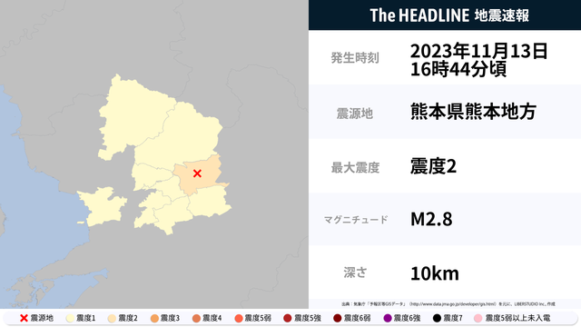 11月13日16時44分頃、熊本県で最大震度2の地震を観測