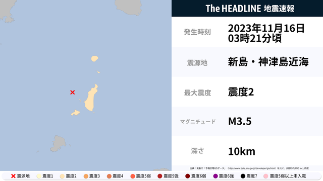 11月16日03時21分頃、新島・神津島近海を震源とするマグニチュード3.5の地震が観測された。最大震度2を観測したのは、東京都。