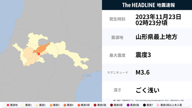 11月23日2時23分頃、山形県最上地方を震源とするマグニチュード3.6の地震が観測された。最大震度3を観測したのは、山形県。