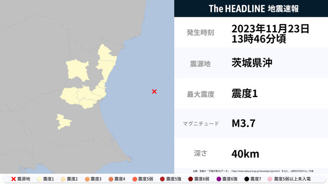 11月23日13時46分頃、茨城県沖を震源とするマグニチュード3.7の地震が観測された。最大震度1を観測したのは、茨城県。