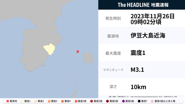 11月26日9時2分頃、伊豆大島近海を震源とするマグニチュード3.1の地震が観測された。最大震度1を観測したのは、静岡県。