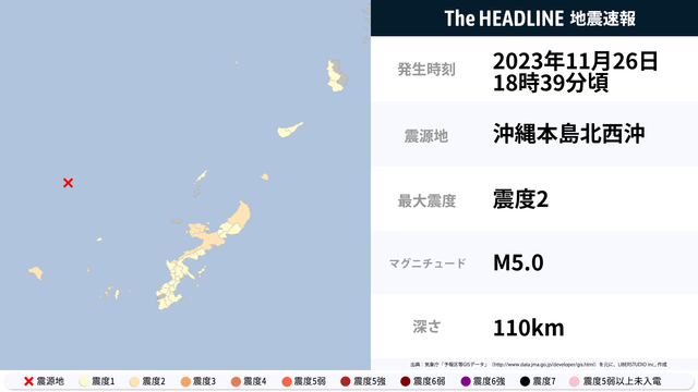 11月26日18時39分頃、沖縄本島北西沖を震源とするマグニチュード5.0の地震が観測された。最大震度2を観測したのは、鹿児島県・沖縄県。