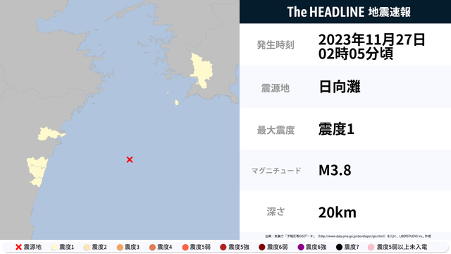 11月27日2時5分頃、日向灘を震源とするマグニチュード3.8の地震が観測された。最大震度1を観測したのは、高知県・宮崎県。