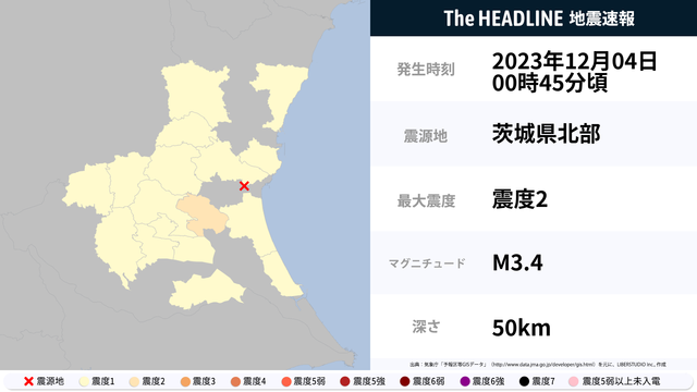 12月4日0時45分頃、茨城県で最大震度2の地震を観測