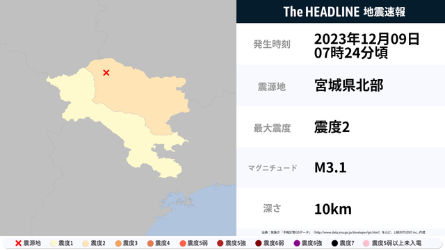 12月9日7時24分頃、宮城県北部を震源とするマグニチュード3.1の地震が観測された。最大震度2を観測したのは、宮城県。