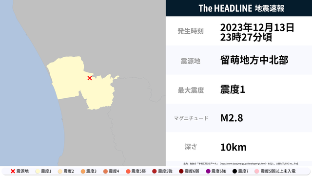 12月13日23時27分頃、北海道で最大震度1の地震を観測